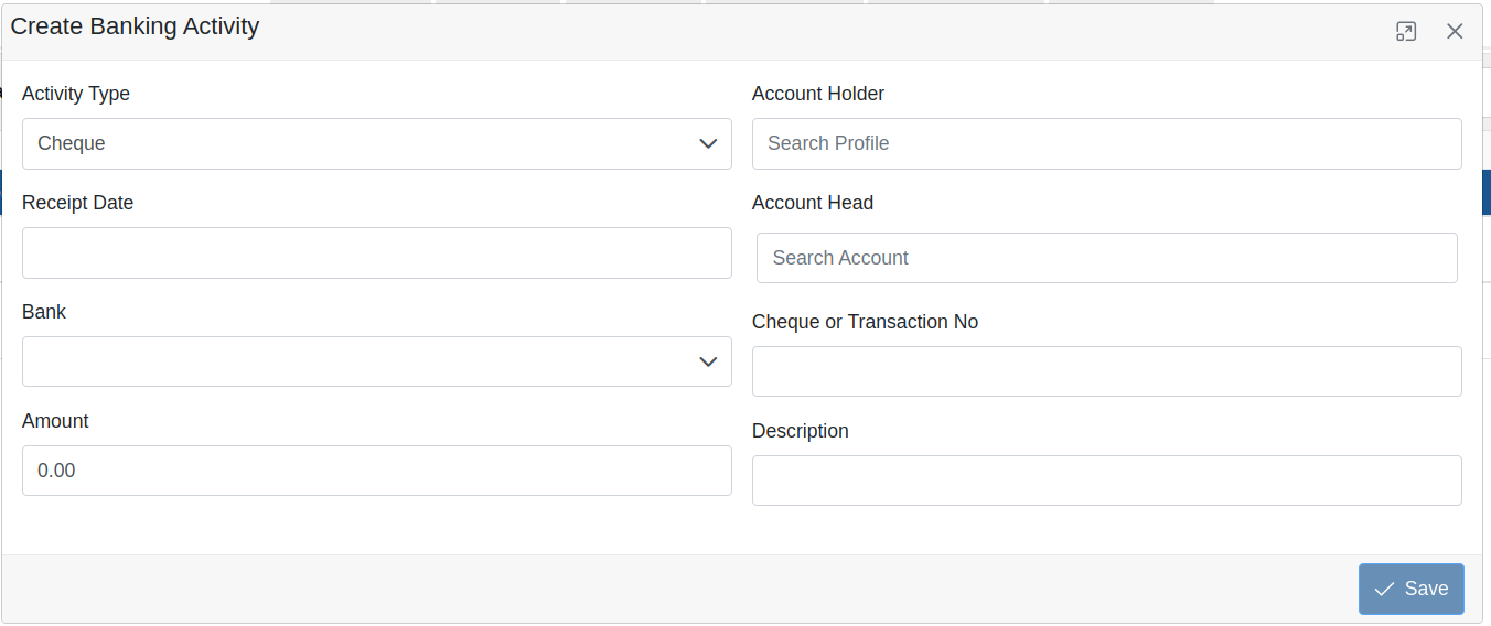 When click on the Plus button a popup screen will appear to pass a banking transaction.