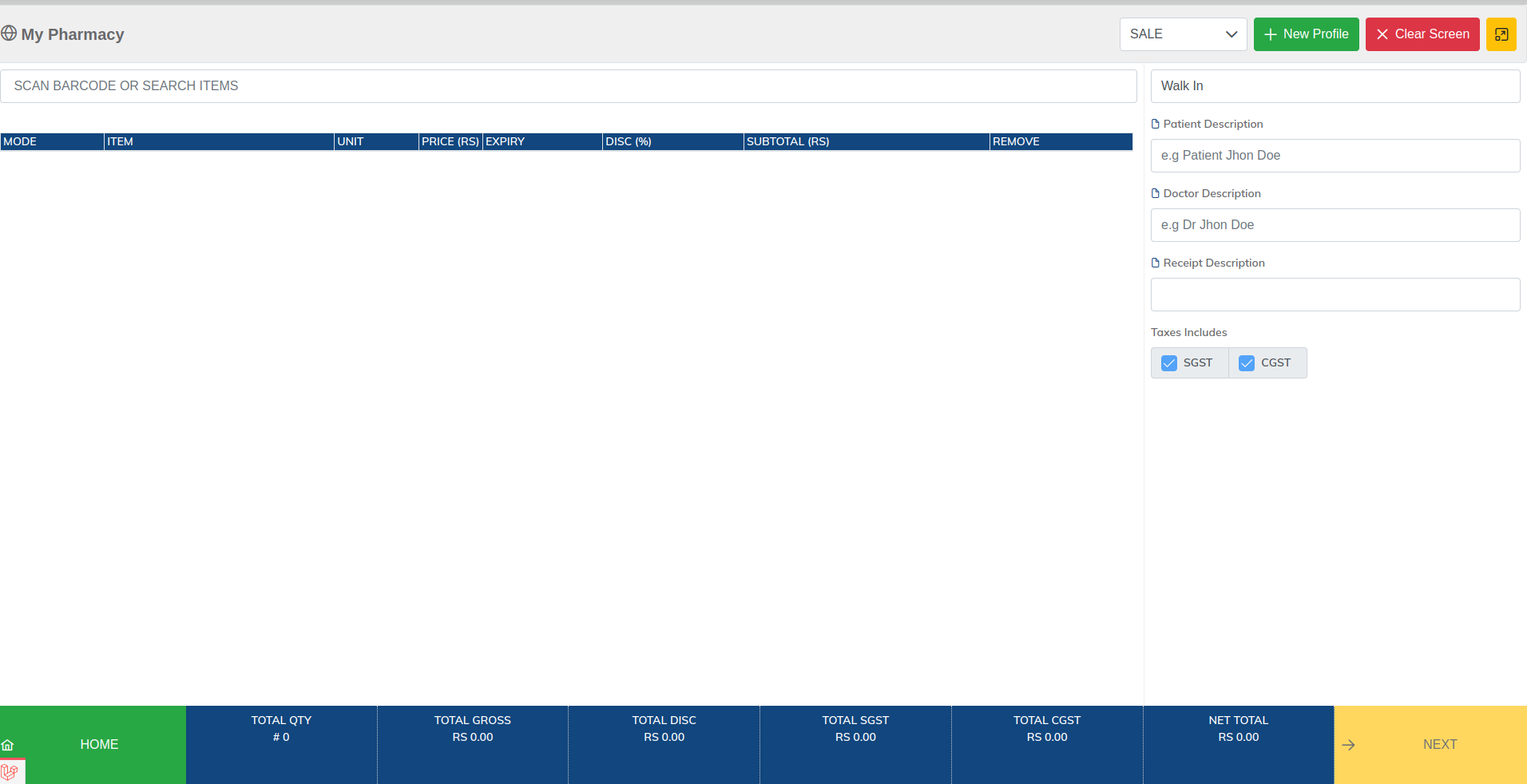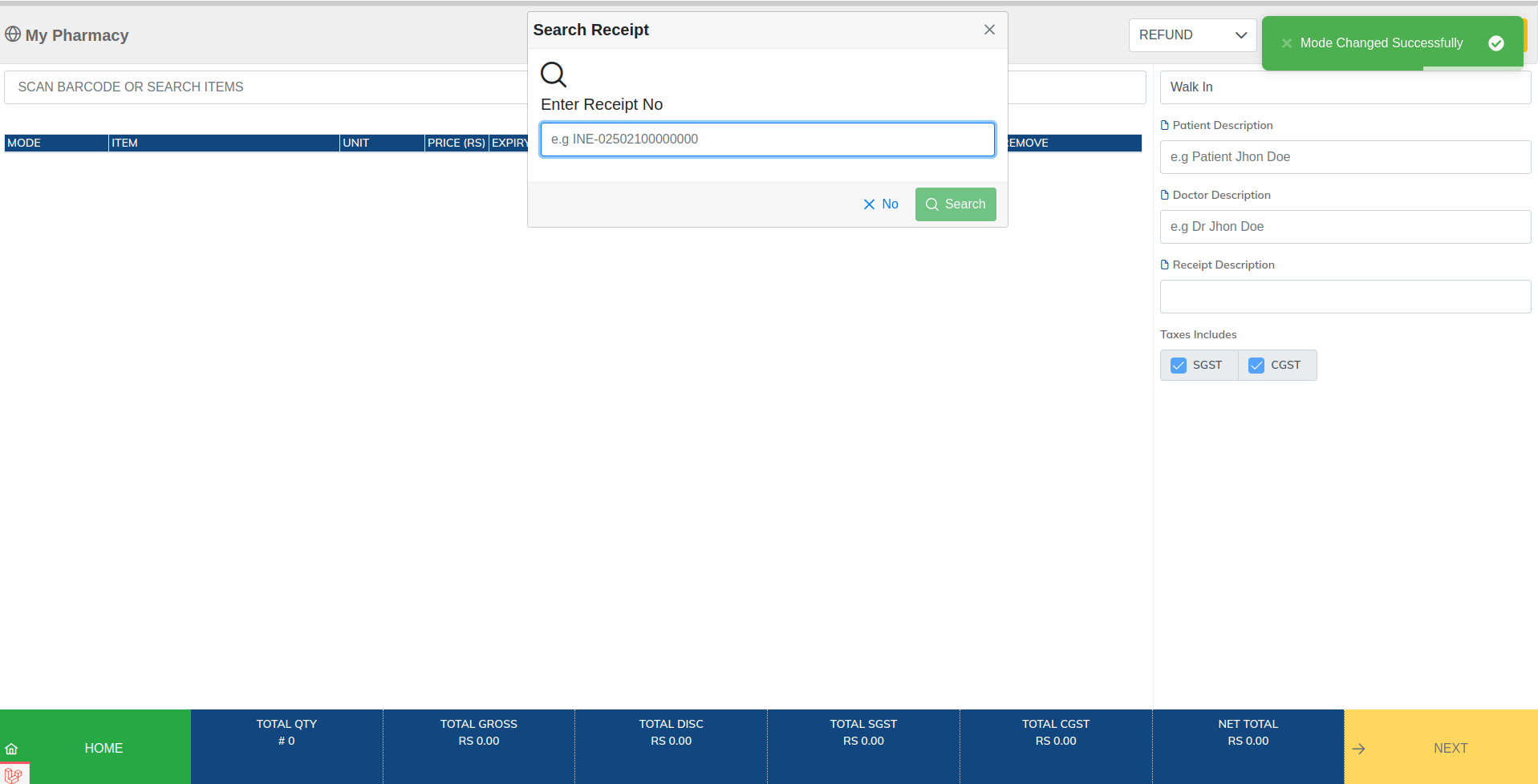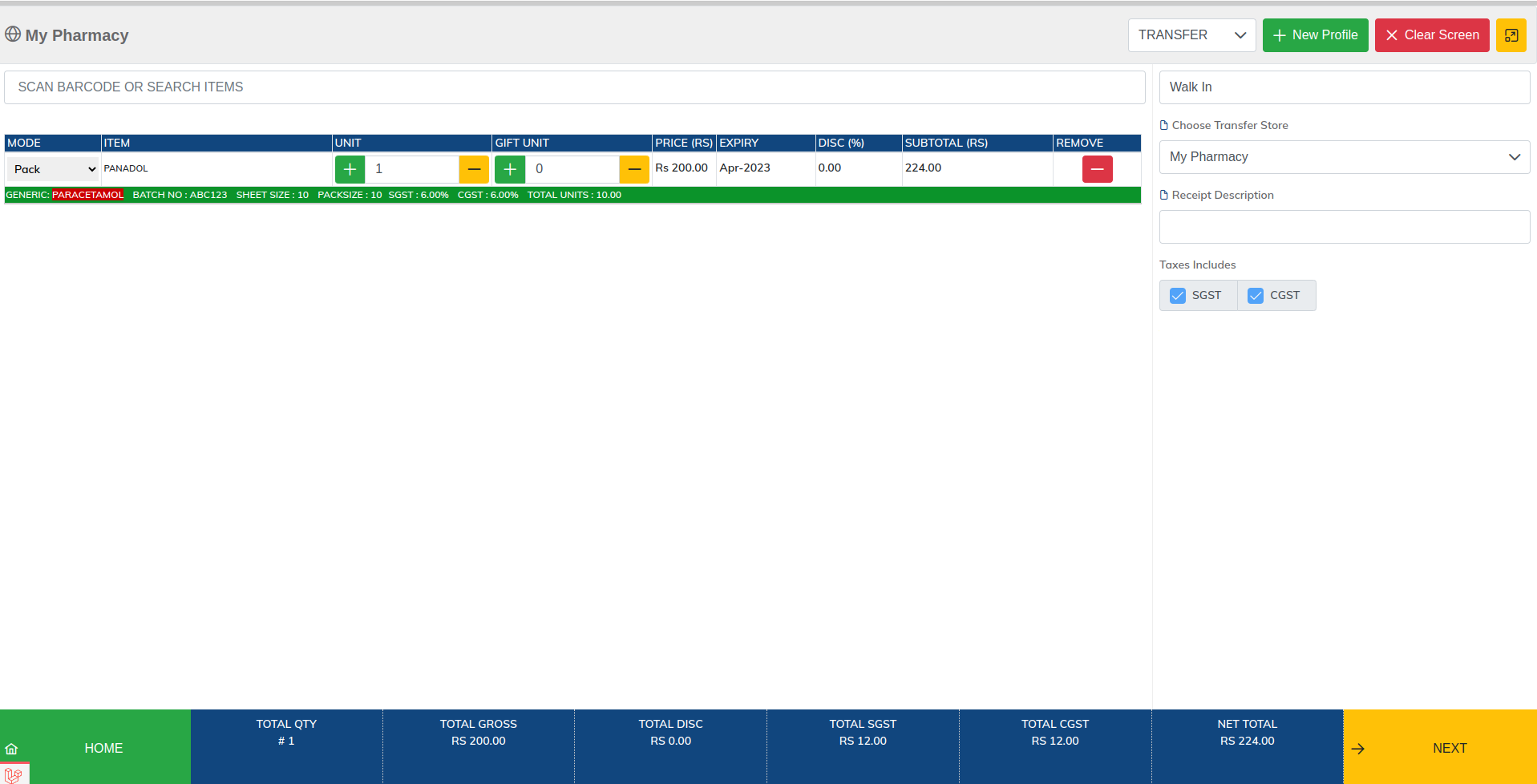 To search the medicine you can either scan the item barcode inside the search area or you can search the goods from here. Remember when searching item it will only show those items or goods whose expiry date is not yet over.