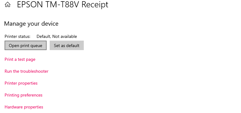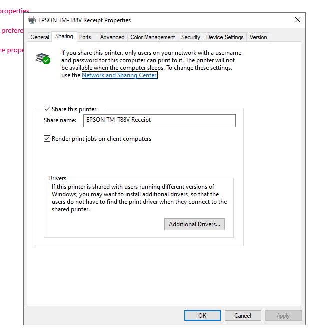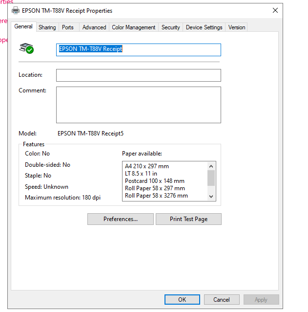 From properties copy the printer name in my case the printer name is EPSON TM-T88V Receipt.
