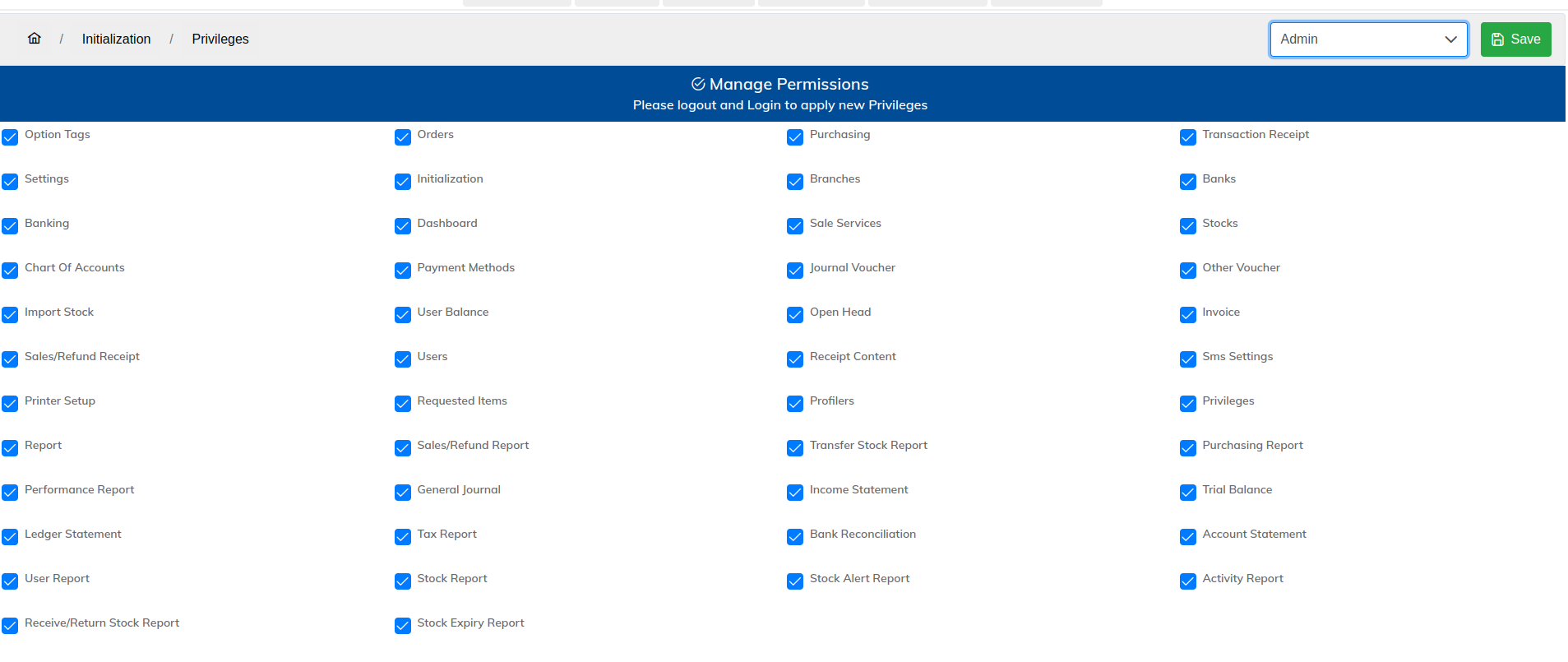 As you can see in the above image admin has all the options access which currently in system exists.You can check and uncheck this options and save the roles.