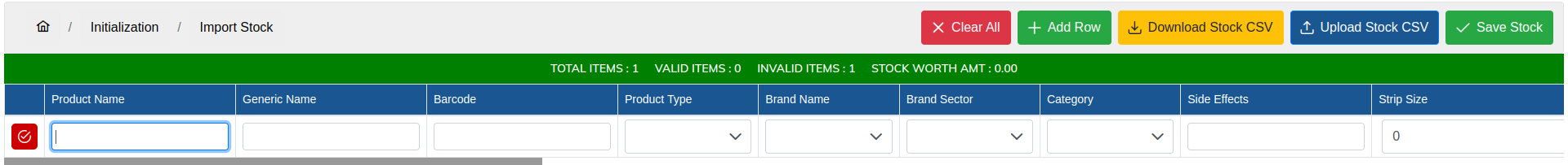 Once you click on the import stock from the initialization menu you will be able to redirected to the import stock screen. Here you will be able to see few buttons on the top and empty fields.Lets discuss the buttons and there actions.