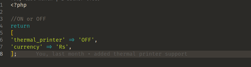 From the above image see the thermal printer option is OFF.Make it to ON like this 'thermal_printer' => 'ON',