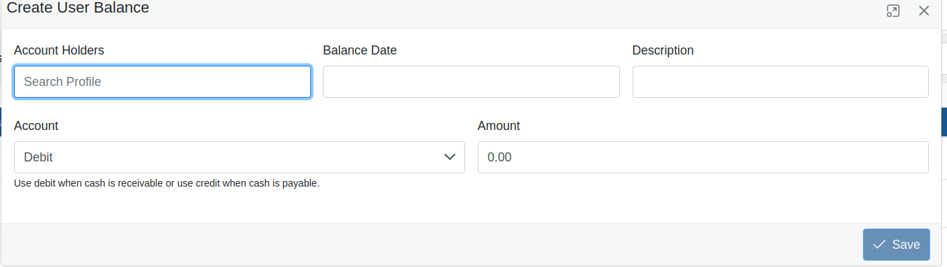 User balance as its name suggests here you need to add all the previous customers and suppliers balances. For example you have a payable to a supplier of amount $100. In user balance here you need to record the previous amount.